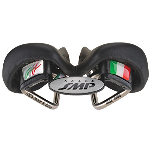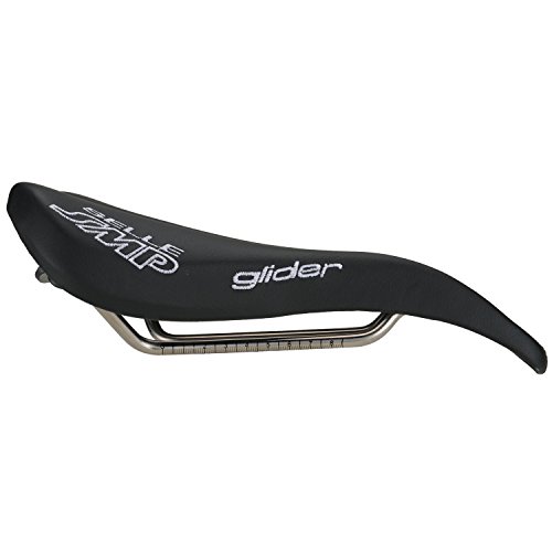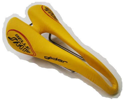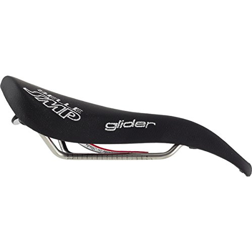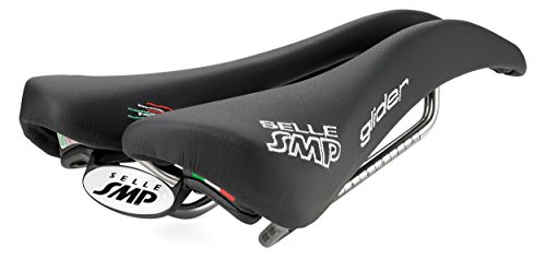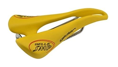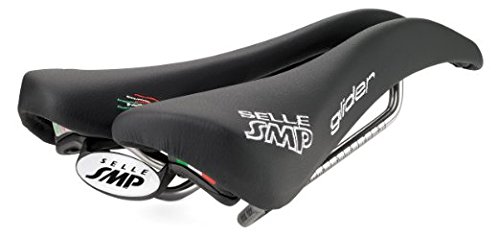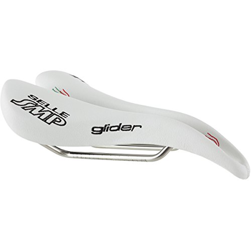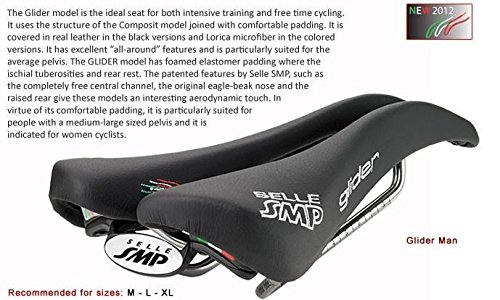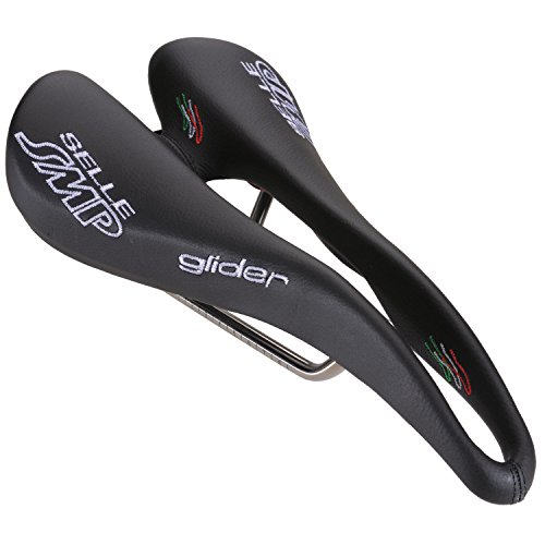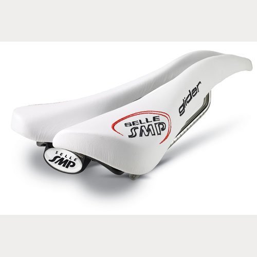 Studio : Selle SMP Publisher : Selle SMP Binding : Misc. Product Description Upon initial inspection, the Selle SMP saddles may not look like they would be your first choice in comfort. But, looks are deceiving, and once you try it, the Glider saddle may just end up being your favorite saddle. They aren't the lightest saddle on the market, but they have been developed and produced after careful consideration of how the body actually interfaces with the bike, and if you are going to spend countless hours in the saddle, comfort trumps weight. The Glider, as with all SMP saddles, features a drop beak-shaped nose which relieves pressure from soft tissue regions. This design also means that when you ride, it's easier to roll forward and keep a flat back. The paddle (widest part of the saddle) has been slightly elevated so that you have something to push on when you climb or take off in the break away. The center of the 136mm wide saddle features a wide cut out which eliminates pressure in the perineal zone. It also keeps all your "bits" from getting crushed. That "highly technical" term is being used all inclusive of the male and female anatomy. Eliminating pinching means The saddle is built upon traditional steel rails and a nylon/carbon fiber composite shell. You won't need to worry about your saddle being able to handle daily grind-fests without collapsing. Additionally, the padding is a foamed elastomer so that it holds its shape. The cover in black is leather and microfiber in the red and white styles. The Selle SMP Glider Saddle is 136mm x 266mm and comes in Red, White, or Black. 0