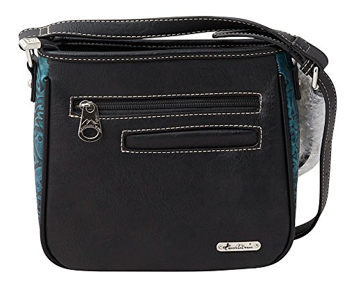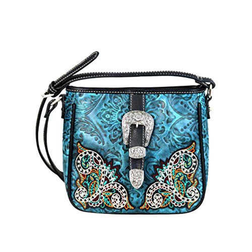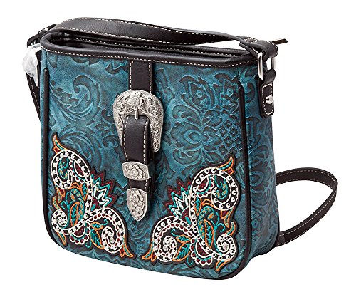 Western crossbody handbag; made of turquoise imitation/PU leather that has embossed pattern background, colorful embroidered floral applique accented with silvertone studs, and a silvertone belt buckle on the front