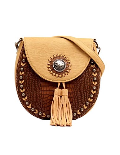- Features a silver-tone Western concho and two faux leather tassel accents on flap.