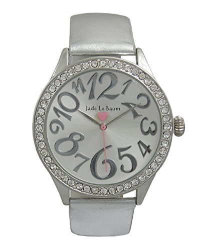 -. Feature : Jade LeBaum by ShoppeWatch Brand Gift Box / Large Round Face Approx 40mm / Rhinestone Accented Silver Tone Bezel / Easy Read Large Arabic Numerals in Silver / Japanese Quartz Movement