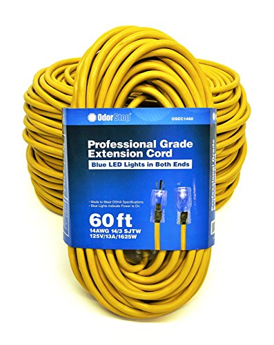 OdorStop OSEC1460 - 60' Yellow 14/3 SJTW Professional Grade Extension Cord with Blue LED Lighted Ends