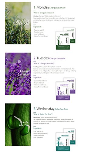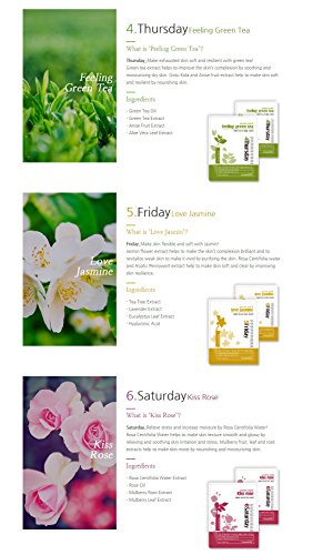 -. Feature : ♥ MONDAY: ENERGY ROSEMARY - Rosemary Leaf Extract will make your skin SOFT and MOIST. Portulaca Oleracea Extract and Anise Fruit Extract will PURIFY your skin and make your skin tone CLEAR and transparent. / ♥ TUESDAY: CHANGE LAVENDER - Lavender Flower Extract will SOOTH your sensitive skin and add MOISTURE to make your skin CLEAR and GLOWING. Aloe Extract and Grapefruit Extract provide nutrition for your skin like vitamins and minerals, which will improve any skin damage like coarsening. / ♥ WEDNESDAY: RELAX TEA TREE - Tea Tree Extract provides soothe and treat stressed skin to make it HEALTHY and SMOOTH. Camellia Sinensis Leaf Extract and Centella Asiatica Extract provide sufficient MOISTURIZING effect and VITALITY to the skin. / ♥ THURSDAY: FEELING GREEN TEA - Camellia Sinensis Leaf Extract will MOISTURIZE and SOOTHE your skin, make your skin tone BRIGHTER, treat the effects of dry skin, and make your skin SMOOTH and GLOSSY. / ♥ FRIDAY: LOVE JASMINE - Jasmine Flower Extract will PURIFY and BRIGHTEN your skin tone. Rosa Centifolia Flower Extract and Centella Asiatica Extract will enhance your skin's FLEXIBILITY and make your skin SOFT, SUPPLE and CLEAR. ♥ SATURDAY: KISS ROSE - Rosa Centifolia Flower Extract will RELIEVE and SOOTH any skin irritation and stress, effectively making your skin texture SILKY SMOOTH and GLOSSY. Morus Alba Extract will MOISTURIZE your skin and make it look YOUTHFUL and HEALTHY.