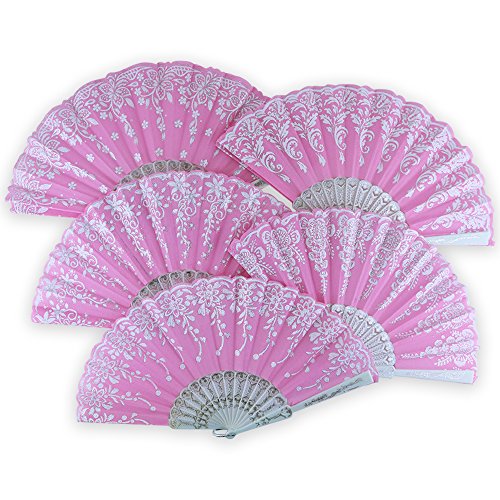 Just Artifacts 9” Glitter Flower Pattern Silk Hand Fans (Set of 5, Baby Pink w/ Silver & White)