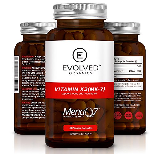 -. Feature : CARDIOVASCULAR HEALTH - Our MenaQ7 Vitamin K2 MK7 supplements are heart healthy supplements that facilitate proper absorption of calcium in the arteries. Vitamin K2 has been shown to help the body utilize calcium in order to inhibit calcium deposits in the arteries for a protective, heart healthy effect. If you think you have a calcium deficiency, it may not be calcium supplements you need. A Vitamin K2 supplement helps absorb calcium that's already in your body that you're already consuming. / STRONG BONES: When calcium is properly absorbed from the bloodstream, it can be utilized to build bone density. Taking bone health supplements like Vitamin K2 can help individuals who have thinning, weak bones to build stronger bones. Vitamin K2 is also believed to support healthy teeth, aid calcium absorption, prevent inflammation, support healthy brain function, promote healthy skin, and prevent wrinkles. / 180MCG MENAQ7 - MenaQ7 is a patented form of Vitamin K2 (MK-7) for bone and cardiovascular health. Our clinical dosage of MenaQ7 is stronger than the dosage in many Vitamin K2 supplements, and it is the only clinically proven dosage associated with improved bone and heart health. Consult your healthcare provider P.R.Ior to use if you are taking blood thinning medication, pregnant, nursing, taking any medication or have any medical conditions. / ONLY THE BEST QUALITY - Our vegan, soy and gluten-free formula is completely non-GMO in order to bring you the purest supplement possible. All Evolved Organics supplements are also 3rd party lab tested and certified for both purity and potency, so you can be confident you are getting the highest quality. All of our supplements are also made in the USA in an FDA approved Current Good Manufacturing Practice (cGMP) facility. This Vitamin K supplement is a supplement you can take with confidence. / LIFETIME SATISFACTION GUARANTEE - Evolved Organics is invested in the health and happiness of our customers; that's why we make customer satisfaction a top P.R.Iority. If you are not completely satisfied with your purchase for any reason, please contact us. We will issue a full and prompt refund. No questions asked, just the best guarantee of any Vitamin K2 on Amazon. There's absolutely no risk involved in buying from us. So add to cart now. Love our supplements or your money back.