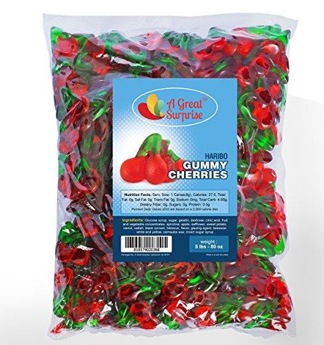 -. Feature : These Haribo gummy cherries are a great tasting fruity cherry flavored gummy candy that will satisfy everyone's craving for sweets and are irresistable. Their bright, cheerful twin look with a green stem make them resemble the real thing. / These cute little treats are perfect for baby showers or children's birthday parties. Place a bowl of these cute cherries on each table as a colorful centerpiece. / These candies also make a great garnish for ice cream sundaes or for fruity cocktails and will put a smile on everyone's face. / Try them out! Buy in bulk to save money. Approximately 100 pcs per pound. Includes 5 lbs. Great candy that will be loved by kids of all ages (and adults too). / Items are repackaged in a facility that may contain milk, soy, peanuts, tree nuts, eggs, wheat and all other allergens.