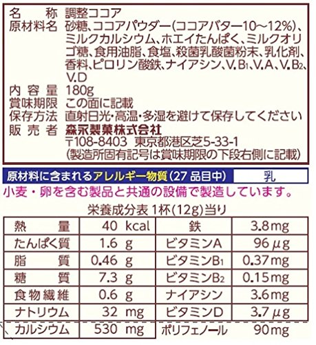원재료:설탕,코코아 파우더(코코아 버터10~12%)고, 밀크 칼슘,《호에이》담백,밀크 올리고당,식용유지,식염,살균 유산균 분말,유화 제,향료,《피로린》산철,나이아신,V.B1,V.A,V.B2,V.D
