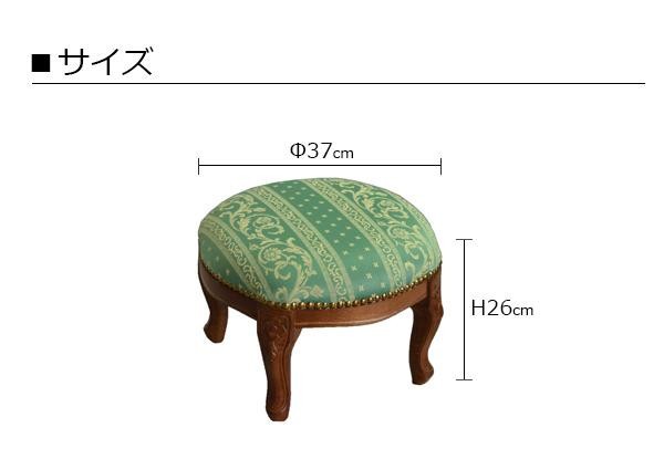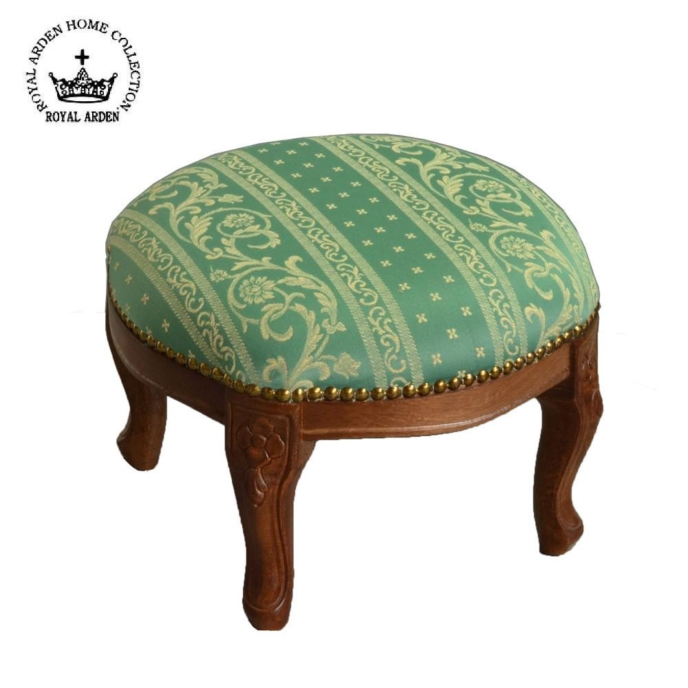 アンティーク調のおしゃれなスツールです。エレガントなお部屋にぴったり。 製造国:イタリア 素材・材質:脚:天然木ビーチ材ファブリック:ポリエステル56%、綿44% ※サプライヤー直送品 ご注文後5~6営業日後の出荷となります【商品名】ロイヤルアーデン イタリアスツール ラウンドミニスツール グリーン 茶脚 51452