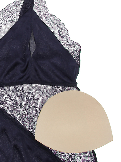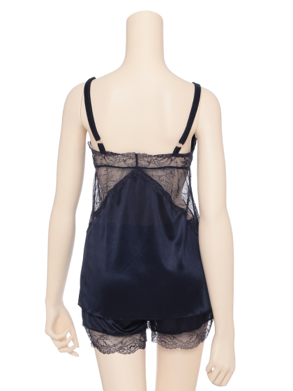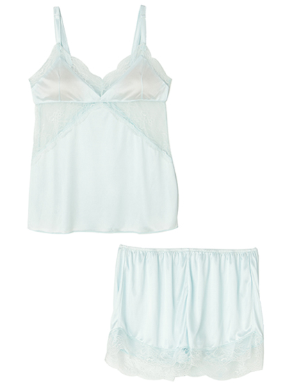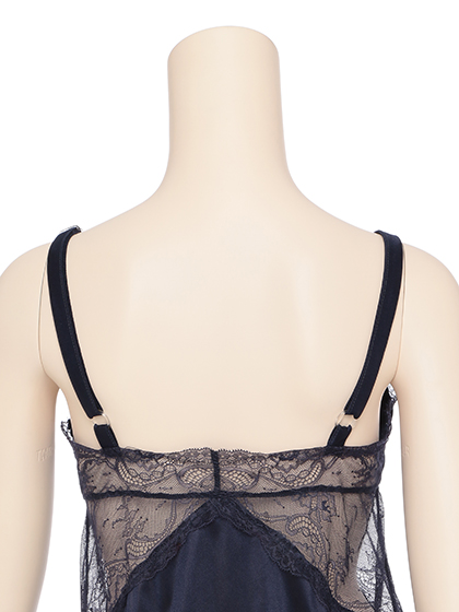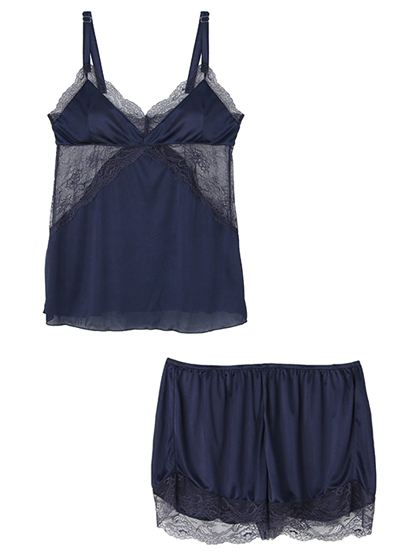 胸もとのVラインやボトムの裾にあしらわれた繊細なレースが、素肌を可憐に魅せて。