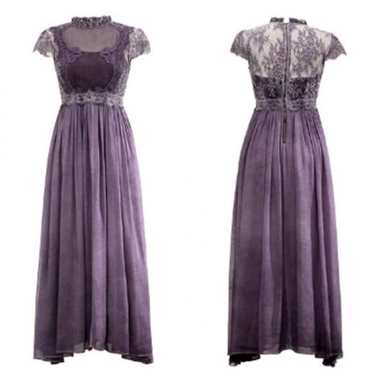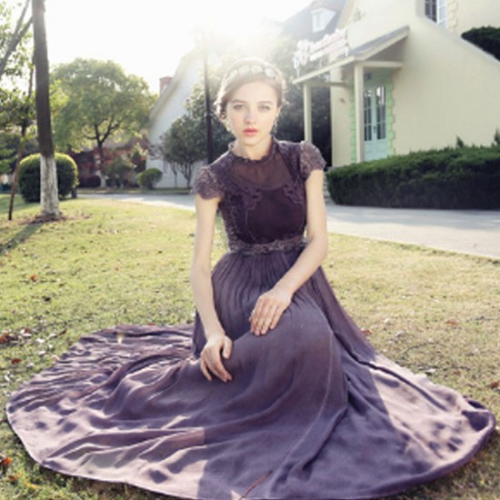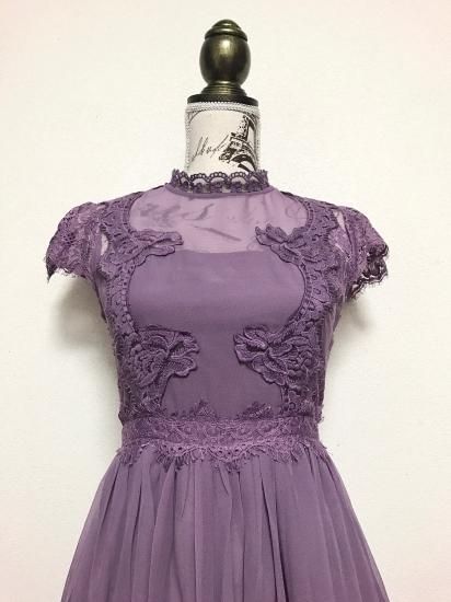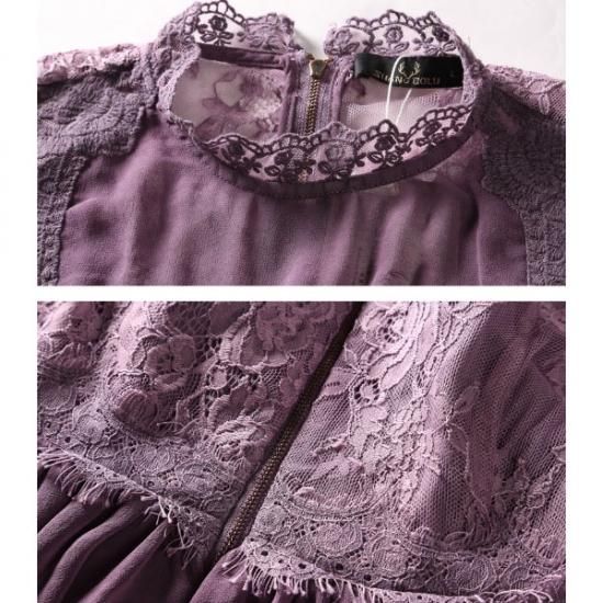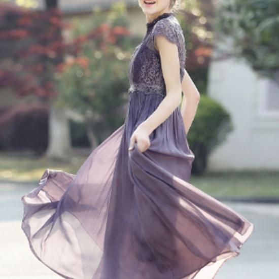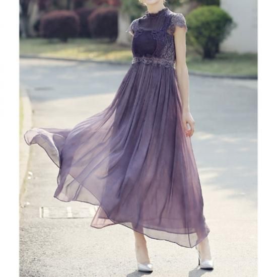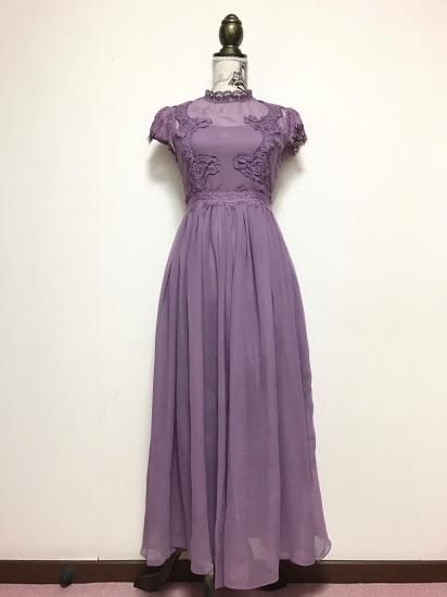 パーティードレス ロング丈 ワンピース 紫 シフォン フレア レース 胸下切替 パープル ハイウエスト 上品 エレガント 大人 可愛い お呼ばれ drgz2154