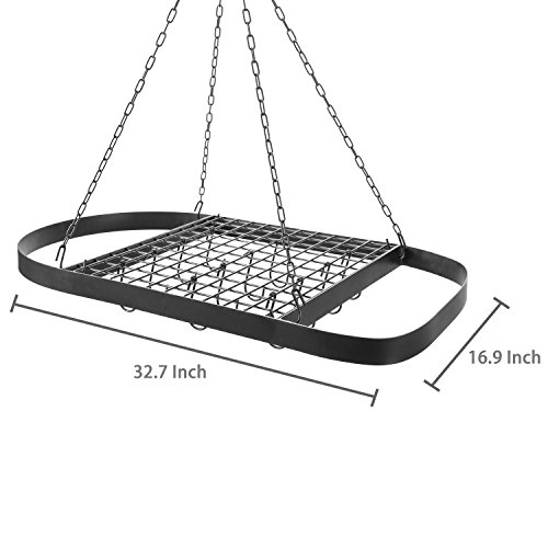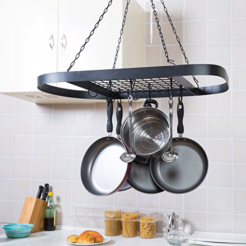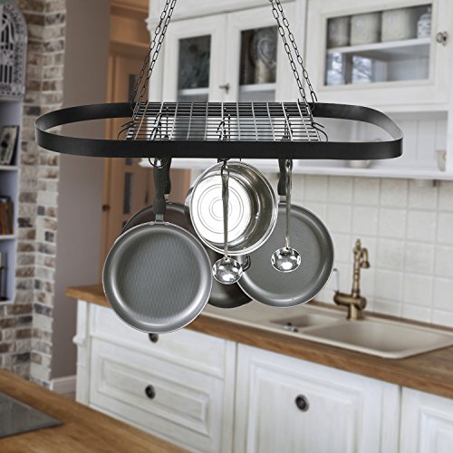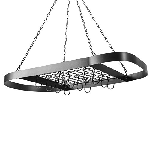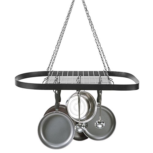 Studio : MyGift Publisher : MyGift Product Description Maximizing use of space while minimizing time spent rifling through cupboards to find the right pot for the job, the hanging pot rack has earned its place in restaurant and commercial kitchens. This black metal oval rack offers a clear and easy view of all available cookware so cooks can work as efficiently as possible. With the included 22 inch chain and ceiling mounting hooks, this rack can be hung at a desired height and provide easy access to pots, pans, or utensils without the need for leaving the stove area. 12 hooks provide storage for a mix of pots, pans, and utensils, while the wire grate shelf provides a place to store lids or a stockpot. Give the kitchen professional-style efficiency with this space-saving hanging cookware rack. Pots, pans and cookware not included. ** Professional mounting is recommended.** Approximate Dimensions (in inches): 1.5 H × 16.9 W × 32.7 L; grate shelf - 16.8 W × 15.8 L; ceiling mounting chain - 22 L 0 |