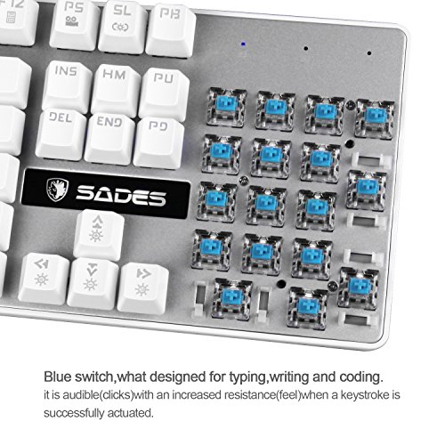 -. Feature : Blue Switches: Sensitive and Responsive. Easy to press and fast response. Each key gives your finger a strong sense of support. Your ideas will flow with the clear and crispy sound of every click. / User Friendly: Plug and play, easy to use. Ergonomic designed keyboard, long time to use without fatigue. 7 light effect modes make your typing more interesting. Press FN+SL to change light mode. / Full Keys Anti-Ghost: Full 104 standard keys anti-ghost. 19 keys without conflict, 12 multimedia keys, WIN key can be disabled for gaming. Keyboard will come into dormancy when not in use with 10 minutes, press any key to wake. / Extreme Durability: Passed 50 million times keystroke test. With laser carved never faded key characters, top grad ABS material and metal, the keyboard is durable for years of using. / Broad Compatibility: Support computer system including Windows10, Windows 8, Windows 7, Mac OS, Windows XP, Windows VISTA, etc.
