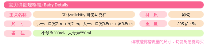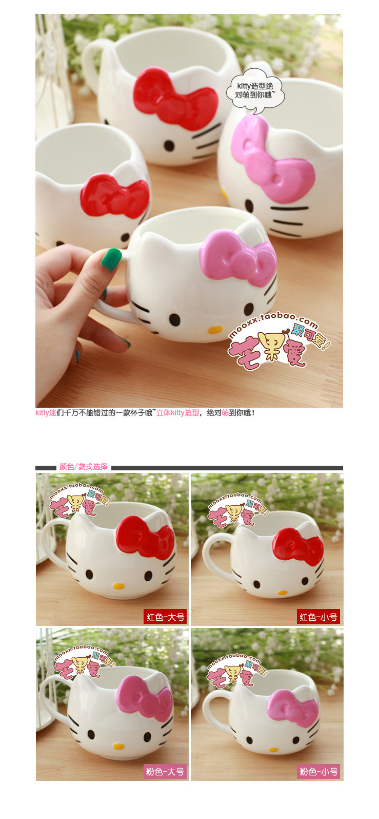 Amount: 201mL (inclusive) -300mL (inclusive) Popular elements: cartoon Material: ceramic Price range: 20 yuan -29.9 yuan Brand: Hello Kitty Color Category: Pink - Small (300ml) Red - Small (300ml) Red - Large (550ml) Pink - Large (550ml) Style: cartoon