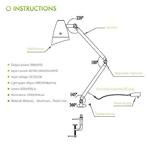 ★ Clip-on Clamp Lamp, Easy to Install- The strong metal desk lamp clamp can support up to 2"/5cm(max) thick desk.Space saving, suitable for reading,office,art workshop,architect,etc.
