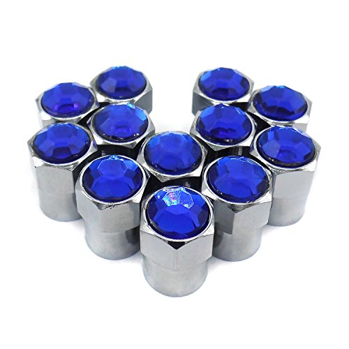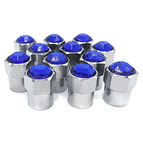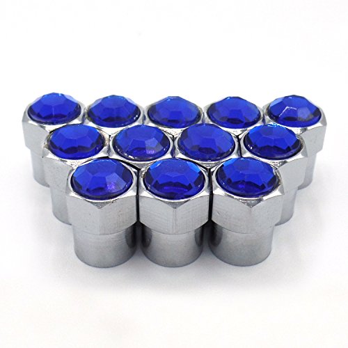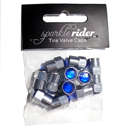 Sparkle Rider Valve Stem Caps - Custom Blue Crystal Rhinestone Bling - Chrome plated metal cap fits Schrader valves - Cool tire rim air covers for your car, motorcycle or bicycle wheels - 12 pc set
