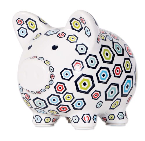 - Feature : Painted ceramic coin bank for baby / Measures 5" x 6" and stands 4.25" tall / Wide coin slot and rubber plug / Loverboy print by iota baby design / Packaged in a gift box with ribbon
