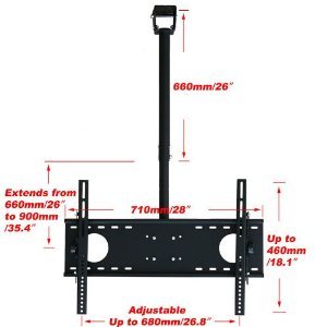 - Feature : VideoSecu ceiling mount design to fit most 32" 37" 40" 42" 46" 47" 50" 52" 55" 58" 60" display with VESA 200x200mm to 680x460mm mounting holes / Loading capacity up to 110 lbs; Fits flat ceiling, vaulted ceiling, as well as the wall / Adjustable height ranges of 26" to 35.4" from ceiling in 4" increments optimal viewing height / Forward and backward tilt and 360 degrees pan adjustment to achieve the ideal screen viewing position / Standard hardware pack included