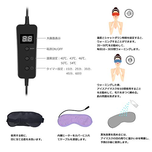 アイマスクは、USB電源に接続するだけでアイマスク中のヒーターが温まり、ヒーターの温度は35~50℃で、カバーを介して熱が伝わるので肌にやさしい心地良い温度で、約40℃の温熱とともに心地よい温度で目と目元をやさしく包み込みます。マスクを外したときに、目元のしっとり感がたっぷり実感してください。