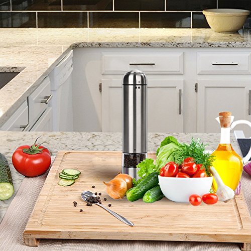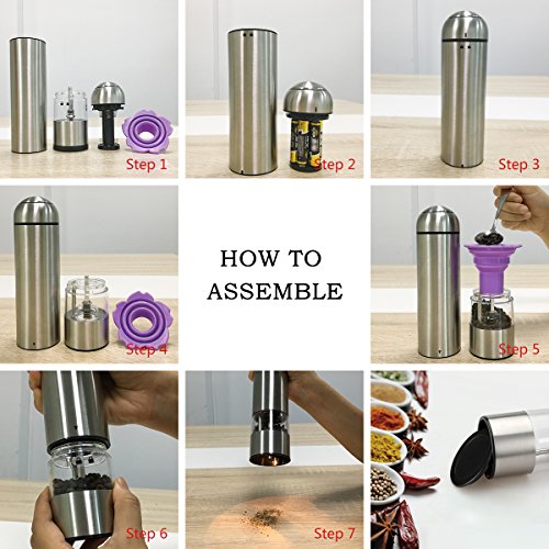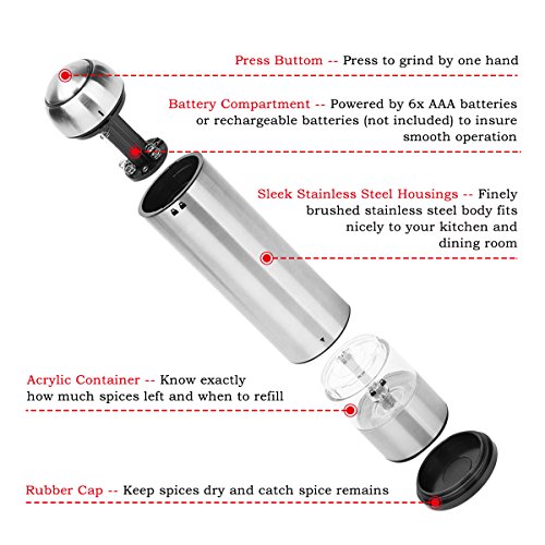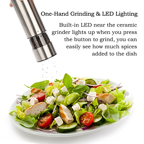 - Single-Hand Automatic Grinding: the cordless salt and pepper grinders are battery powered, using 6 AAA batteries (excluded) for each mill; you can easily trigger the electric grinder and complete grinding by one hand with pressing one button on the top, which makes the salt and pepper shakers easy to use even by disabled and arthritic hand. The LED Light at the bottom illuminates the food all through the grinding process that allows you to see how much you are dispensing.