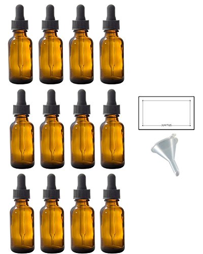 1 oz Amber Glass Boston Round Dropper Bottle (12 pack) + Funnel and Labels for essential oils, aromatherapy, e-liquid, food grade, bpa free