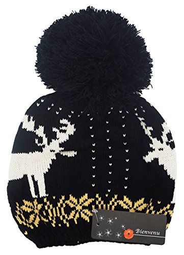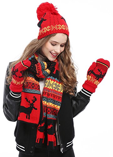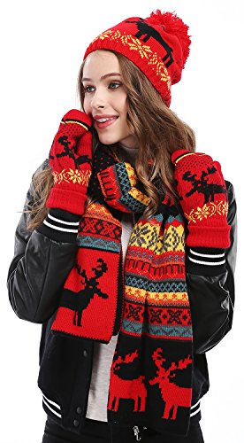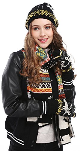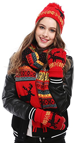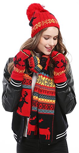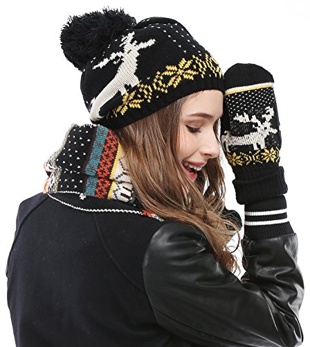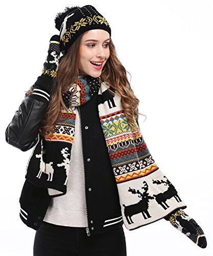 -. Title : Women Scarf & Glove Set, Knitted Snowflake Deer Detail & Matching Cap
