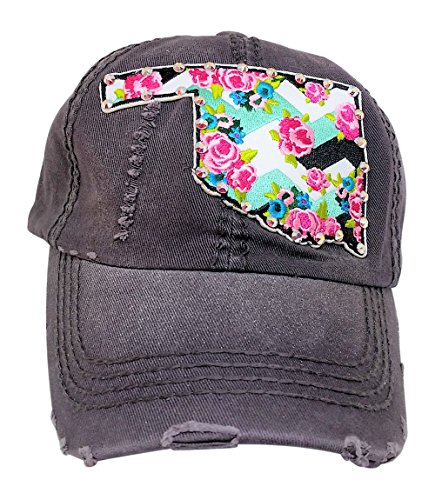 -. Binding : Apparel -. Brand : Loaded Lids -. Color : Grey Brown -. Department : womens -. Feature : Professionally embroidered patch on a distressed women's fit cap / High quality austrian crystals are hand applied in the US / Patch is designed in US by Loaded Lids / Wash finish, low profile soft cap fits most adult females;features designer style faux leather buckle -. ProductGroup : Apparel -. ProductTypeName : HAT -. Size : One Size -. Title : Loaded Lids Oklahoma Embroidered Bling Floral Baseball Cap