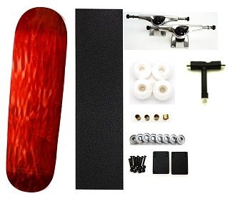 -. Feature : 1pc skateboard deck (buttom stained), color option: natural, black, blue, red, green / 1set (2pcs) 5" skateboard trucks (silver) / 1set (4pcs) 52mm skateboard wheels (white) with Abec 7 metal bearings and spacers / 1pc 9x33" skateboard griptape / 1set (8pcs) skateboard hardware , 1set (2pcs) skateboard risers