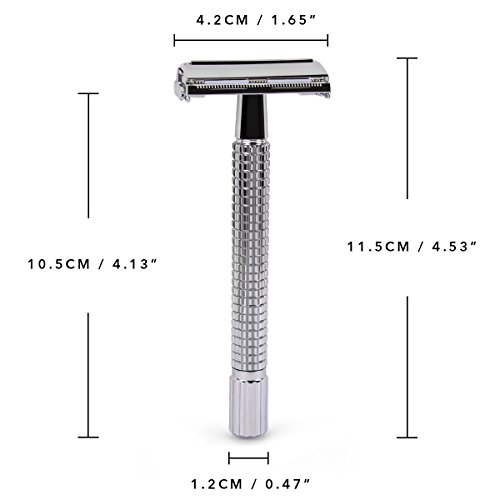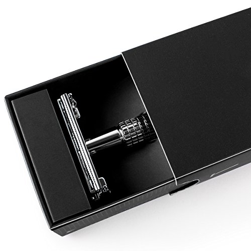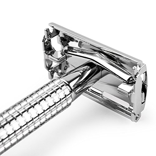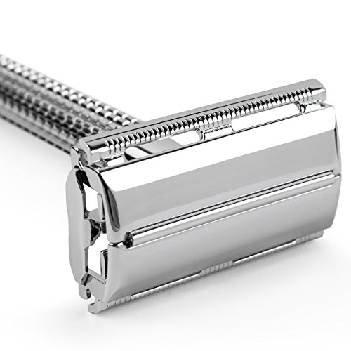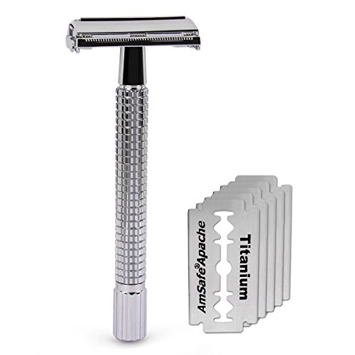 Double Edge 4 inch Long Handle Safety Razor Twist Butterfly Open Shinning Finish (1 Razor + 5 pcs Titanium Coated Blades)