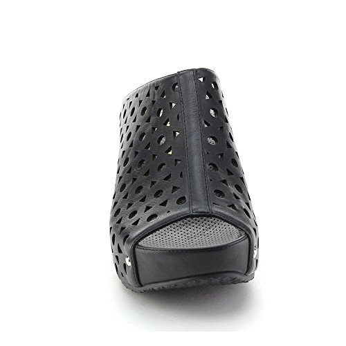 Product Description Hit the streets in design sporting these fabulous mule sandals. Featuring peep toe front, faux leather upper with cutout details, studs at sides, wrapped platform and heel, and finished with padded footbed for comfort. 0