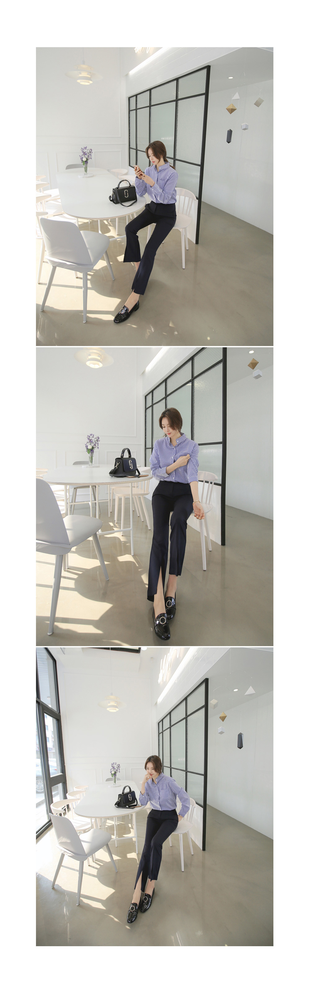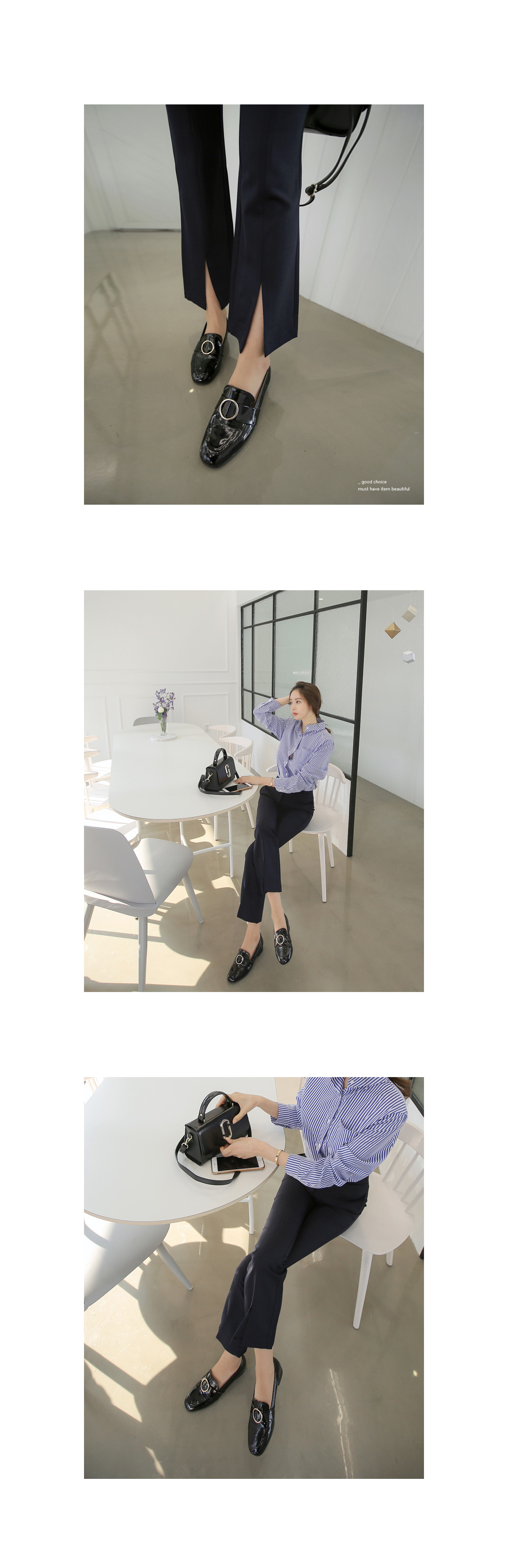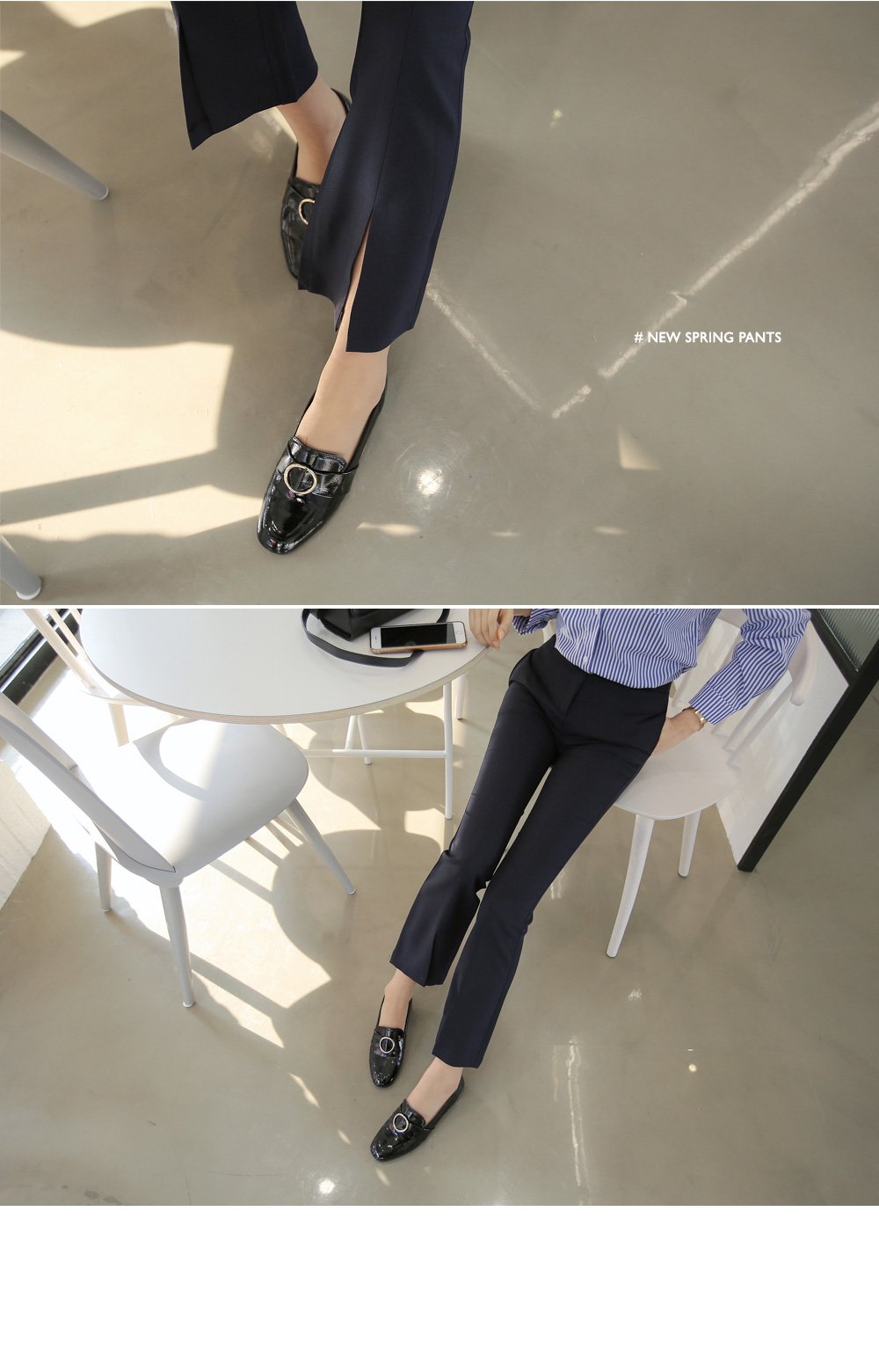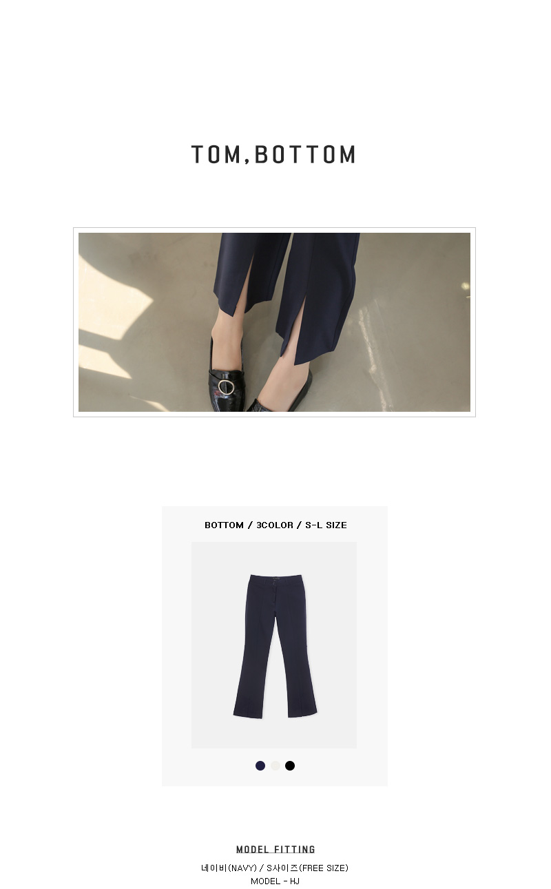 모던한 느낌의 부츠컷 슬랙스를 소개합니다.다리 라인을 한층 더 날씬하고 예쁘게 연출해주는 슬림핏으로트임 디테일이 더해져입었을때 더욱 매력적인 아이템이랍니다.센터 부분 단추와 지퍼 디테일로 오픈, 클로징을 편하게 도와주며포켓이 함께 구성되어 더욱 실용적인 아이템이에요.부츠컷 디자인으로 트랜디한 무드를 더했으며셔츠, 니트, 티 등 여러가지 상의 아이템들과 매치하여다양한 스타일로 연출하기 좋답니다.컬러는 네이비, 아이보리, 블랙으로 구성되었으며아이보리 컬러는 비침이 살짝 있을 수 있으니 참고하여 초이스해 주세요.