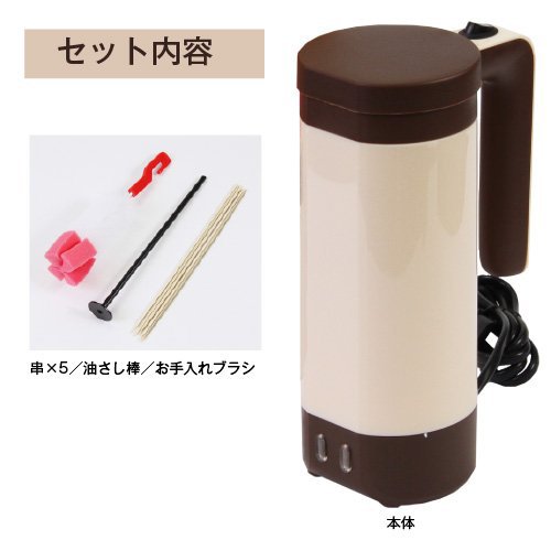 Also for the home party ● Power: AC 100V 50 / 60Hz ● Power consumption: 230W ● Temperature fuse: 98 ° C ● Cord length: About 120cm ● Material: PP resin, aluminum, silicone ● Accessories: skewer × 5, oil stick