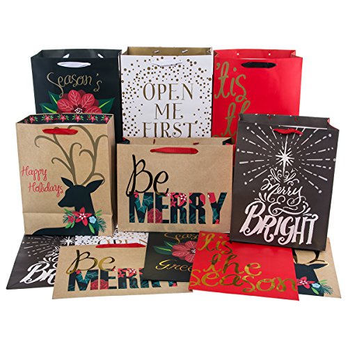 Product Description Kraft Holiday Bags feature designs in shiny foil and sparkly glitter, and ribbon handles that make them easy to carry. These are convenient to have around, especially at a price that's less than you'll find at card shops. 0