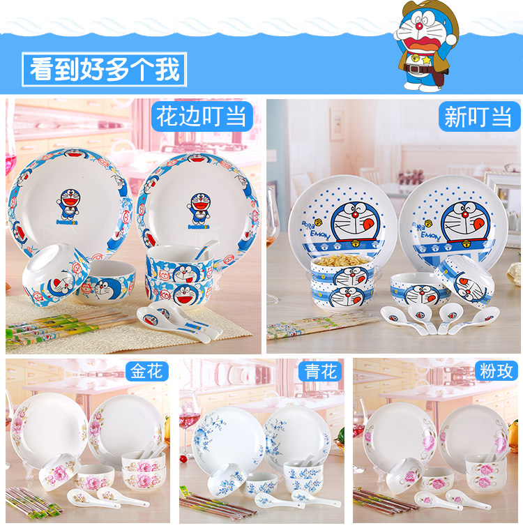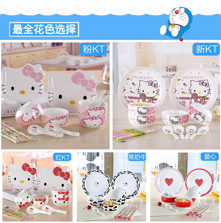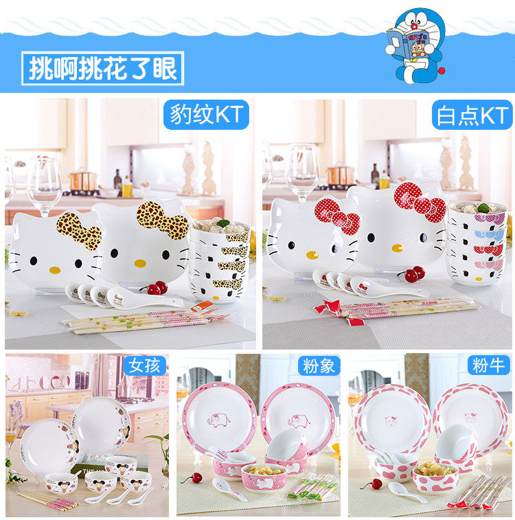 14: 4 bowls two chopsticks 4 tablespoons 4 14 Set in two series: 1. cartoon series: cat dish, pork dish and plate series bears a disc 1 large 1 small flat disk mounted for fruit and vegetables without soup 2. Disc Series: 8-inch circular disc is asoup plate, soup dish equipped for very practical
