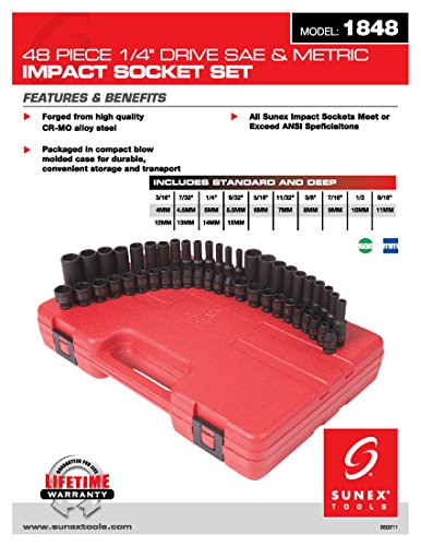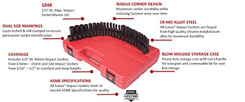 Sunex 1848 1/4-inch Drive SAE and Metric Impact Socket Set, Inch/Metric, Standard/Deep, 6-Point, Cr-Mo, 3/16-inch - 9/16-inch, 4mm - 15mm, 48-Piece