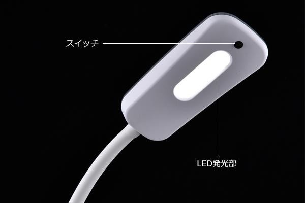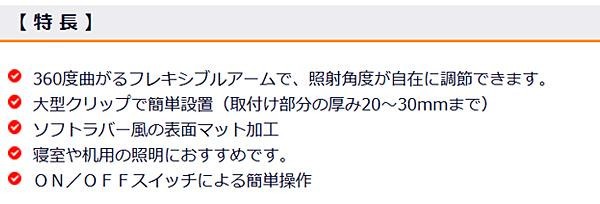 360度曲がるフレキシブルアームで、照射角度が自在に調節できます。ON/OFFスイッチによる簡単操作。寝室や机用の照明におすすめです。