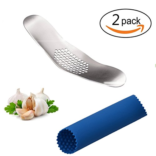 Maxracy Stainless steel Garlic Press Rocker Crusher with Garlic Peeler Silicone Tube Roll Set-Blue