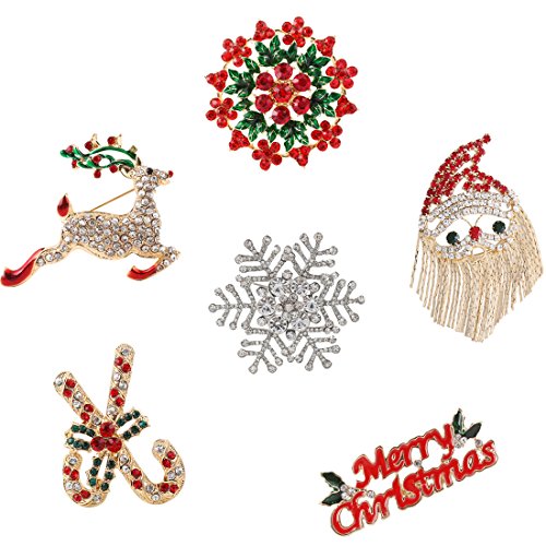 NLCAC Xmas Pin Brooch Crystal Cluster Gold Tone Set of 6 pcs(Santa,Wreath, Reindeer, Snowflake, Candy,Banner)