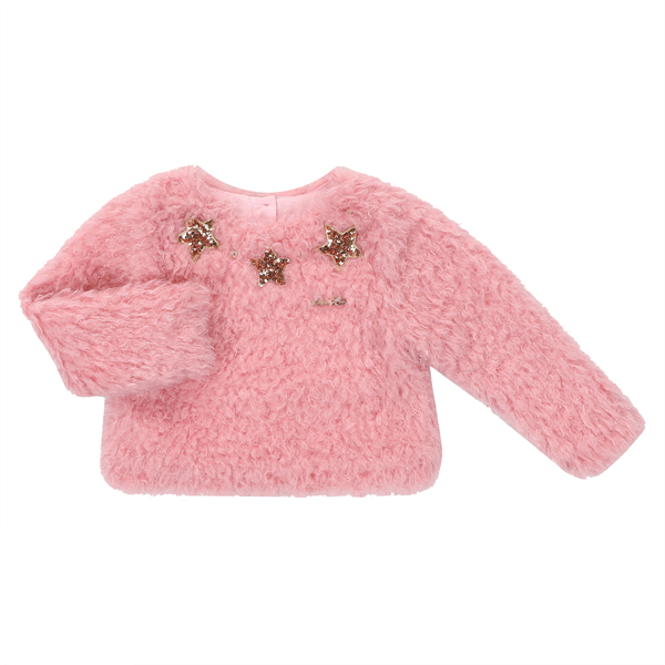 상품설명 핑크 뽀글이 스타탑입니다. 전체 들어간 안감으로 보온성 최고구요. 네크라인을 따라 들어간 스팽글 별 포인트로 엣지를 더한 제품입니다.