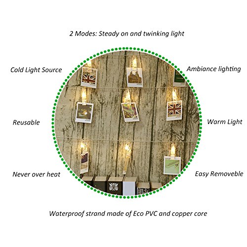 Sites Applicable - 13.3Feet Strand with 20 led chips, and 20 small hooks and chips bonuses allow you to organize the photo string lights in a good shape without a fuss, Great for dorm, bedroom, apartment, home and office . There is 2 lighting modes: steady on and twinkle light