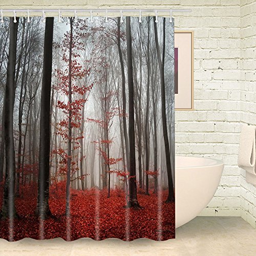 ALDECOR Fabric Shower Curtain Farmhouse Country Home Decor, Mystic Forest Trees and Leaves Red Grass Modern Art Flower Rainy Foggy Gray Scene Print, 66x72 Inches, Black and Gray