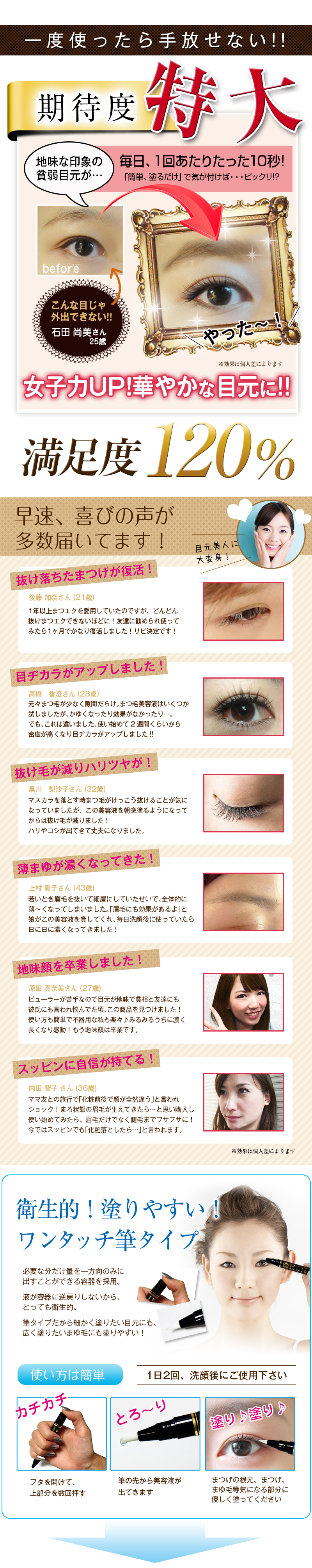 | ご使用方法 | 容器の後部部分を押し筆先に美容液が浸透させ、適量を塗布してください。1日2回程度、洗顔後にお使いください。メイクをする場合はしっかり乾いてから行ってください。 |