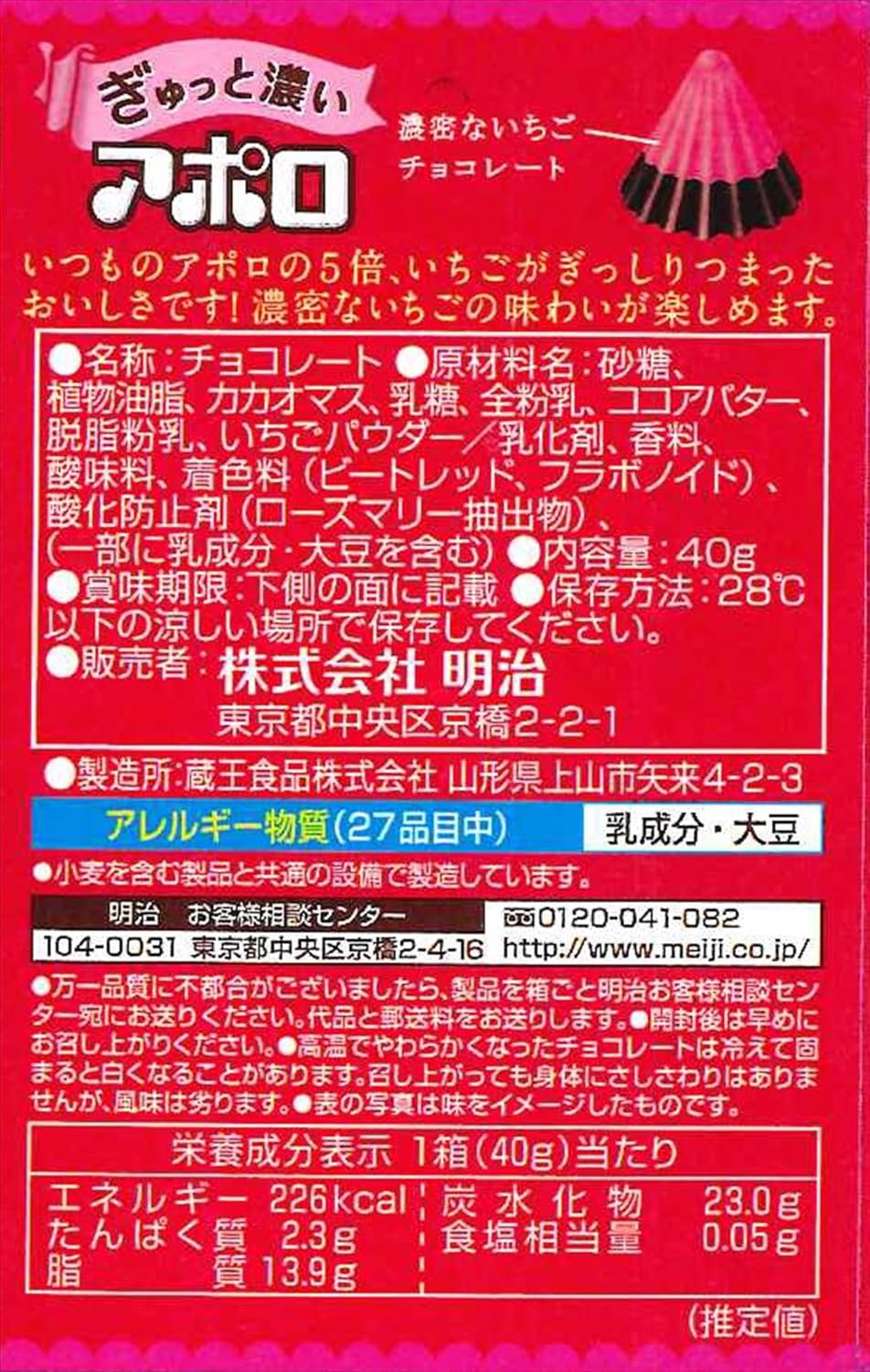 ぎゅっと濃くリッチな味わいの大人かわいいアポロ。通常のアポロと比べて5倍のいちごを使用し、きゅっと濃いいちごをしっかり味わえます。濃い味わいが人気のアポロが、"大人かわいい"デザインにリニューアル! 明治は、赤ちゃんからお年寄りまで、いろいろなシーンでいつもあなたのそばにありたい。おいしさであなたとずっとつながっていたい。昨日より今日、今日よりも明日。あなたの明日をもっとおいしくするために。