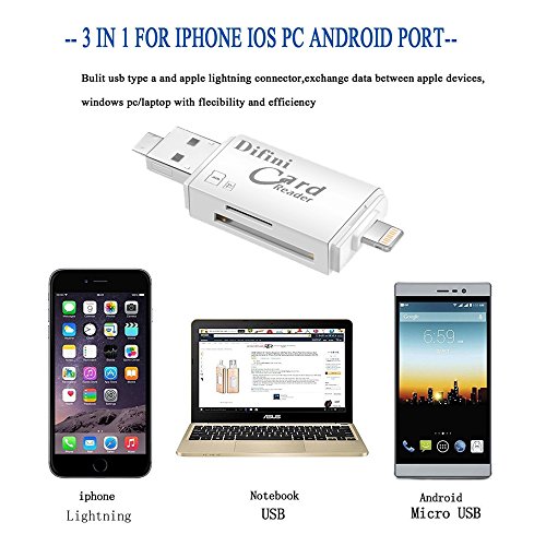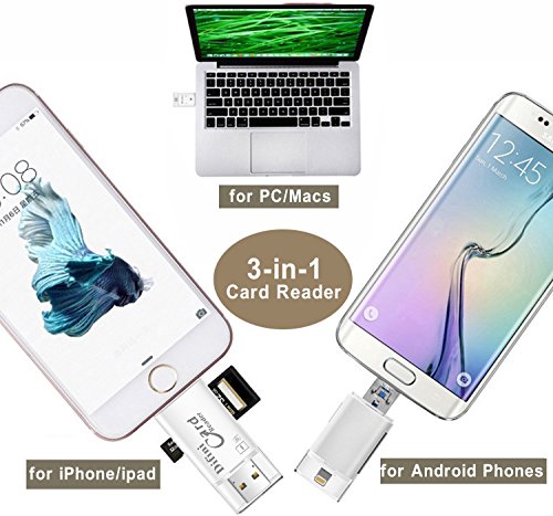🍎Card Reader with three interfaces Lightning connector is for iOS devices; Micro USB connector is for Android devices; USB connector is for computers/Macs