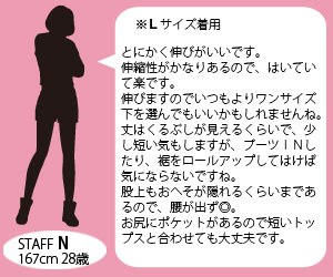 | 注意点 | ▼この製品は生地の特性上、洗濯時に多少縮む場合がございます。 ▼色落ちの恐れがございますので、他の物とは分けて洗濯して下さい。一度お洗い頂いてからのご着用をおすすめ致します。 ▼摩擦や汗、雨などで濡れた時は、他の衣類や下着に移染する恐れがございますので、着用の際はご注意下さい。 |