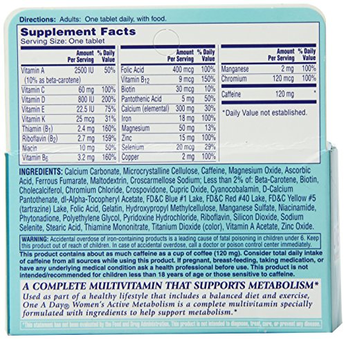 -. Feature : One A Day Women's Active Metabolism is a complete multivitamin specially formulated with ingredients to help support metabolism / Plus, it contains nutrients like Calcium and Vitamin D to support bone strength / This statement has not been evaluated by the Food and Drug Administration / This product is not intended to diagnose, treat, cure, or prevent any disease