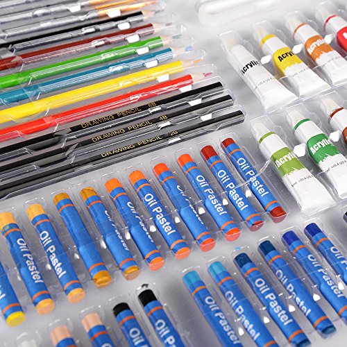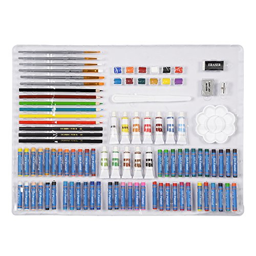 - CREATIVITY SET INCLUDES: 54 oil pastels,12 acrylic colors,12 watercolor cakes, 6 painting brushes, 6 coloring pencils, 3 sketch pencils, sketch paper, palette, palette knife, white eraser, kneaded eraser, pencil sharpener, easel, bag.