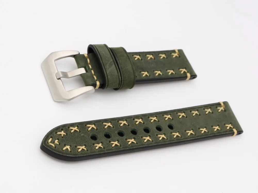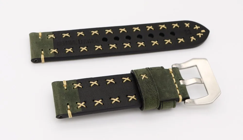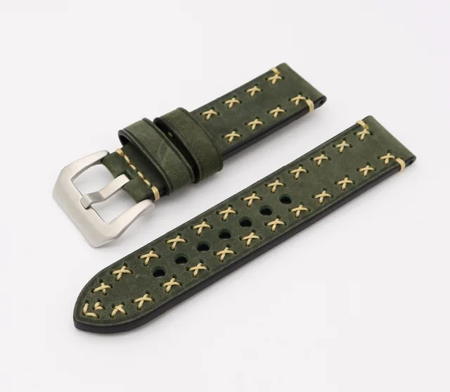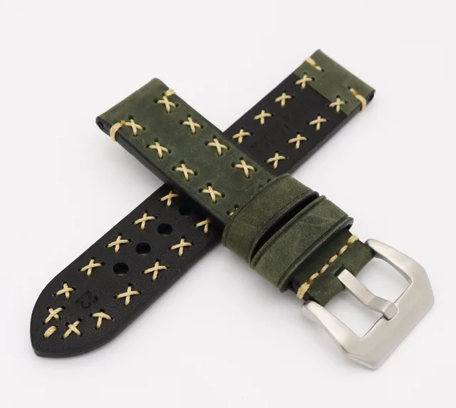 | [해외] 20 22 24 26 미리메터 최신 남성 여성 육군 녹색 시계 밴드 정품 소 가죽 수제 스티치 두꺼운 밴드 스트랩 벨트 핀 버클 |