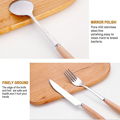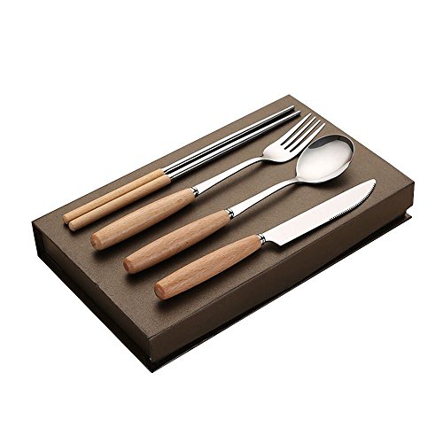 Ufine Wooden Handle Stainless Steel Flatware Set of 4,Include Knife/Fork/Spoon/Chopsticks,Dishwasher Safe