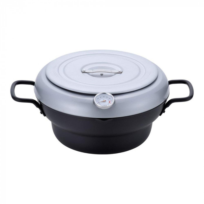 蓋の裏側で油きりができ、スマートに天ぷらができます。油をより安全に扱える油はねガードと温度計付き。パーツは全て取り外すことができます。 |