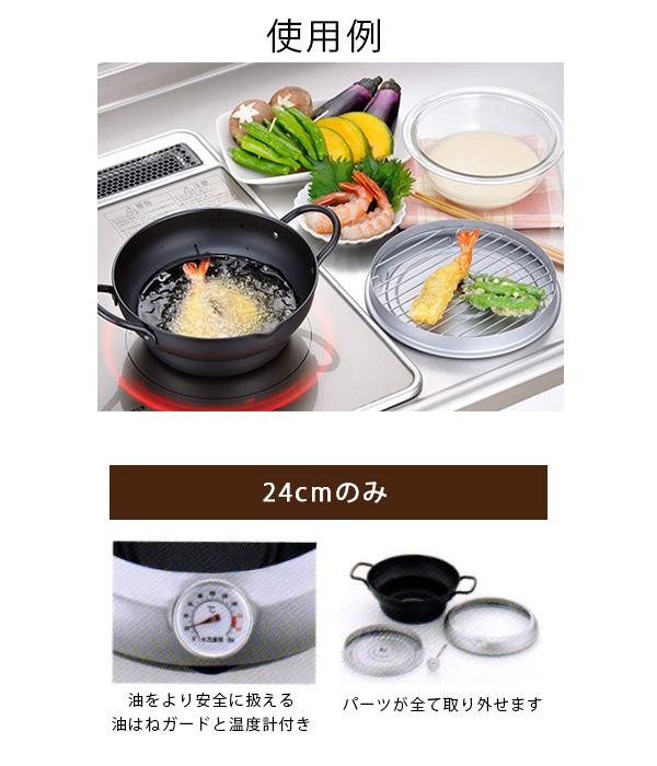 | 蓋の裏側で油きりができ、スマートに天ぷらができます。油をより安全に扱える油はねガードと温度計付き。パーツは全て取り外すことができます。 |