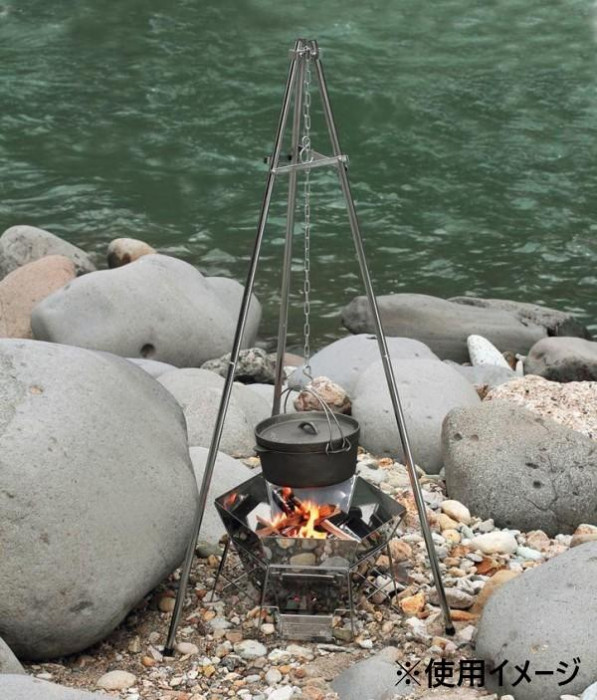| ダッチオーブンや大型鍋が吊るせる丈夫な三脚。 |